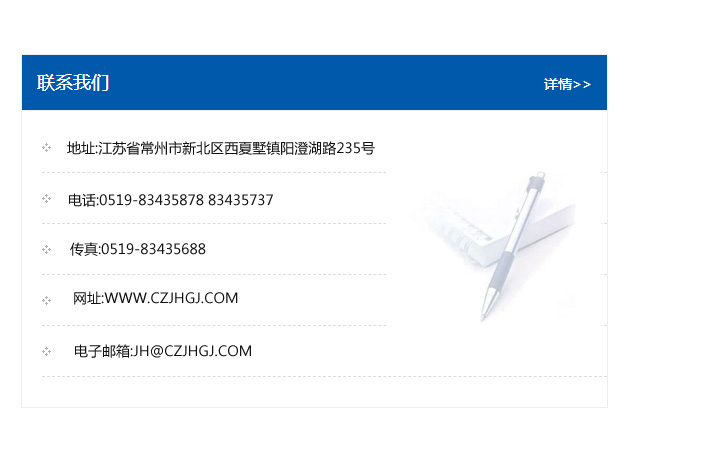 傳真:0519-83435688    郵編:213135    網址:WWW.czjhgj_com.tx-color.com    電子郵箱:JH@czjhgj_com.tx-color.com